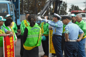 平成25年9月26日(木)AM10:00より、「秋の交通安全県民総ぐるみ運動」の一環として、「東横田町交差点」において、弊社が所属する宇都宮南交通安全協会トラック部会の会員の方々及び宇都宮南警察署長をはじめとする交通課の方々と街頭指導を実施させていただきました。