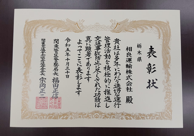 令和5年10月30日(月)、関東管区警察局長・関東交通安全連合会長連名表彰で当社が「交通安全優良事業所」を受賞しました。